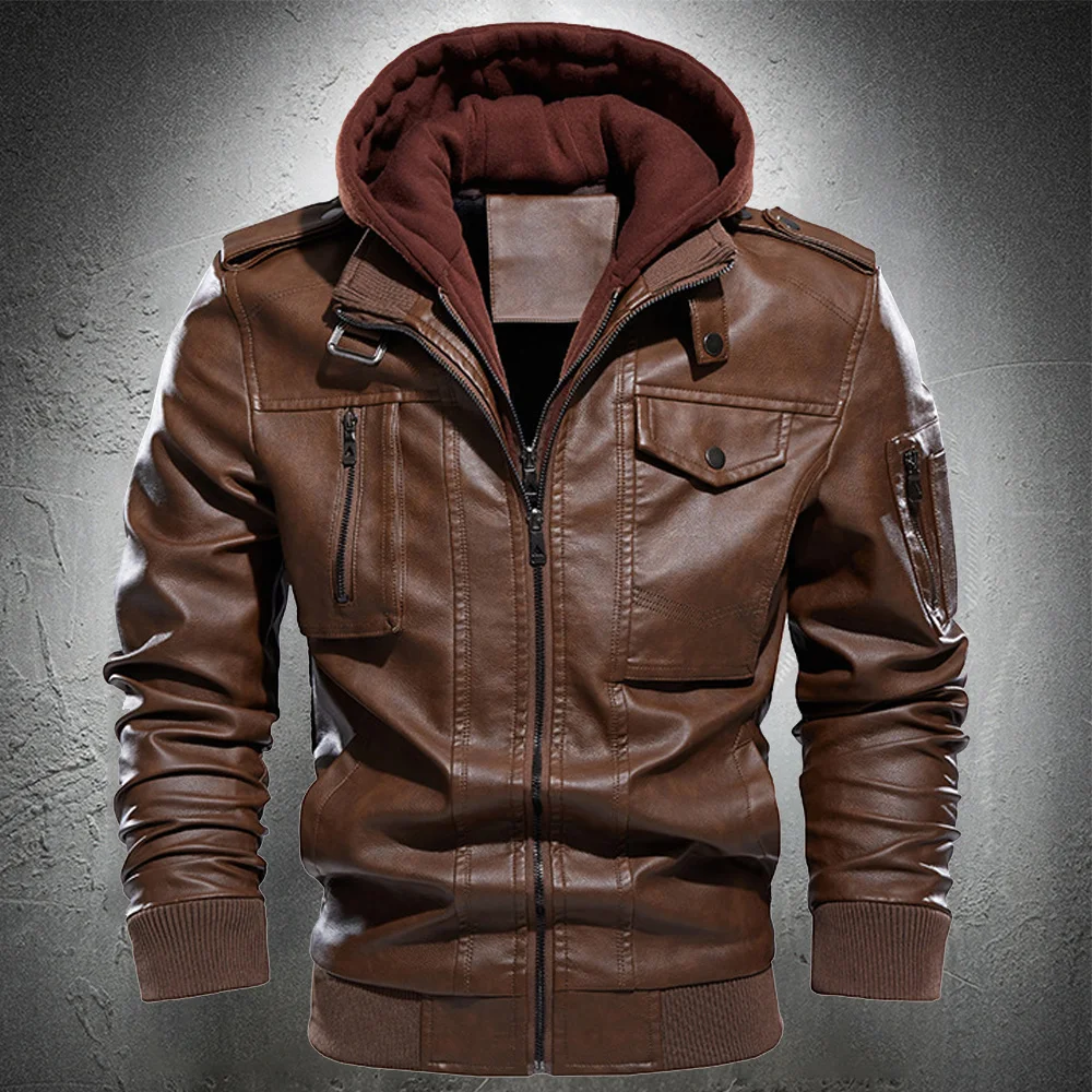 Name: Chaqueta de cuero con capucha desmontable para hombre, chaqueta de motocicleta de cuero marrón, Estilo Vintage, abrigo de moda, Otoño e Invierno